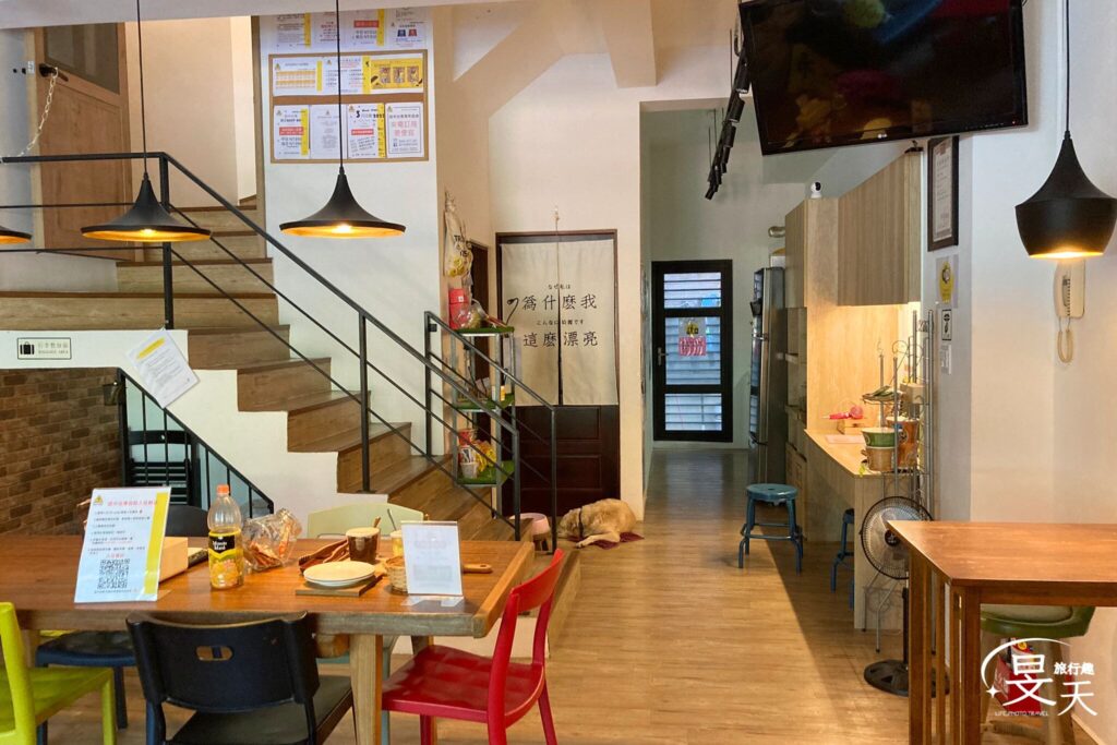 早上起床梳洗好,下去一樓吃早餐,這才發現樓梯旁躺著一隻狗狗,看起來就是店裡的寵物,晚上沒見到牠的身影,白天才發現。牠正睡得香,我也不忍去打擾。民宿準備了免費的早餐食材,我就簡單烤了片土司、抹點果醬,填飽肚子後,跟這個短暫歇腳的地方道別,開始迎接今天漫長的騎程。