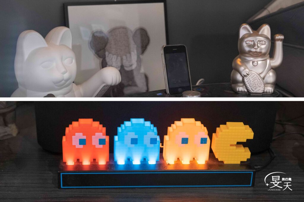 餐具旁有銀色跟灰色的兩隻招財貓,還有「小精靈吃豆豆」遊戲的夜燈~