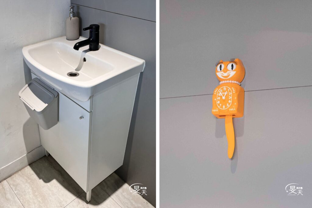 簡易的洗手台能在用餐前洗手,上方還擺有眼睛超大的橘貓時鐘、眼球還會左右擺動