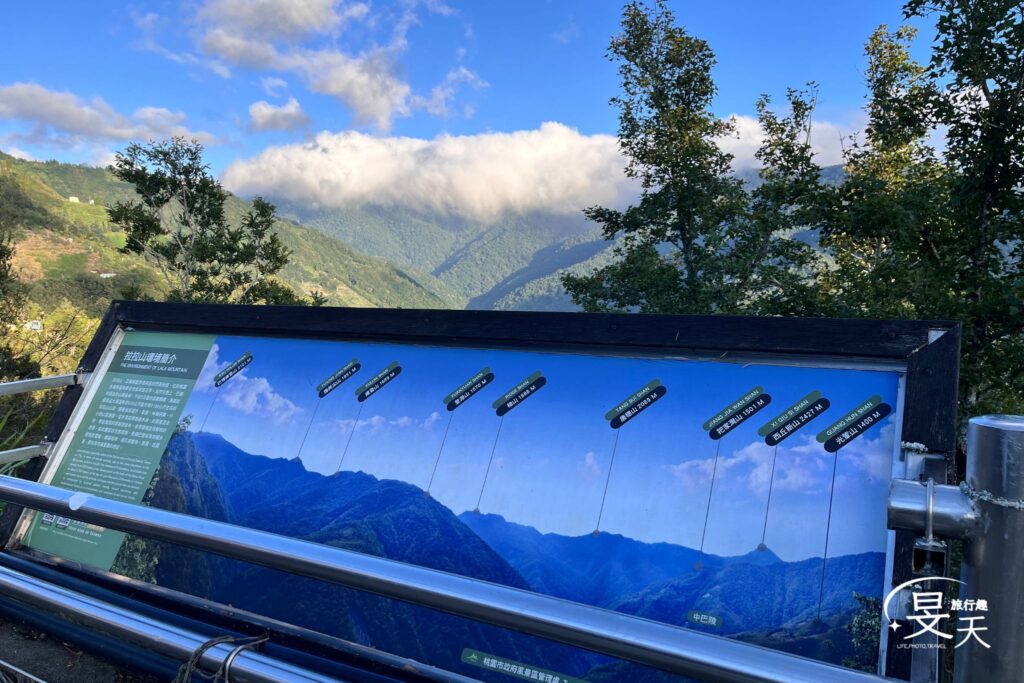 超商對面的山景美得令人屏息,朵朵雲霧輕輕飄浮在山頭上,讓人忍不住在出發前多捕捉了幾張美照。欄杆旁還有一張介紹拉拉山環境的簡介圖,看著圖中的解說,我們也正式踏入了拉拉山的神祕領域。