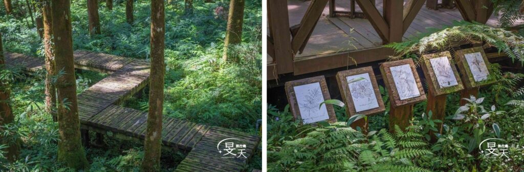 『蕨園森林步道』是熱門的網美打卡聖地,高聳的柳杉木下鋪滿了翠綠的蕨類,在陽光照射下,層次豐富的綠意美得令人屏息。這條步道也能一路延伸,帶著我們順向通往停車場出口。